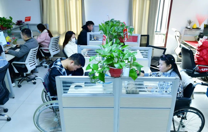 和其他公司不同的是,在杨道林的公司里,还有一群残疾员工,有的坐在电脑前打字,有的语气温和地打着电话,还有的正在学习怎么使用计算机……