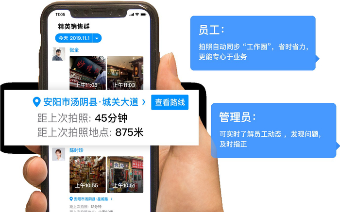 员工到达工作地点后,只需拍一张照片,时间、地点、业务开展情况等信息,会以照片水印的形式,实时同步到“今日水印相机”团队中。管理者可实时查看这些照片,确定员工的出勤情况,现场业务的开展是否符合规范。如发现问题,还可通过评论照片和一键电话,及时指导员工的现场工作。