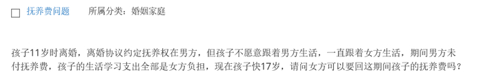 父母在孩子11岁时离婚,根据离婚协议约定,孩子由男方抚养。但孩子不愿意跟父亲在一起,而是一直跟着母亲生活。在此期间,男方既未付抚养费,孩子的生活学习支出也全部由女方承担。现在孩子快17岁了,请问女方可以要回离婚期间孩子的抚养费吗?