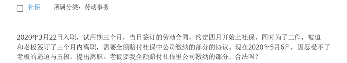 我在2020年3月22日入职且于当日签订劳动合同,公司称试用期三个月,并约定四月开始上社保。为了获得工作,我被迫和老板签订协议:如果三个月内离职,需要全额赔付社保中公司缴纳的部分。现在是2020年5月6日,我因忍受不了老板的逼迫与压榨,提出离职。老板要我全额赔付社保里公司缴纳的部分,他这样做合法吗?