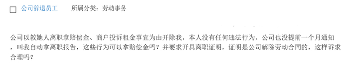 公司以“教他人离职拿赔偿金,商户投诉租金事宜”为由开除我。实际上,本人没有任何违法行为。公司也没提前一个月通知,而是直接叫我自动拿离职报告,老板的这些做法能让我拿到赔偿金吗?另外,我要求公司开具离职证明,想证明是公司主动解除的劳动合同,这样的诉求合理吗?