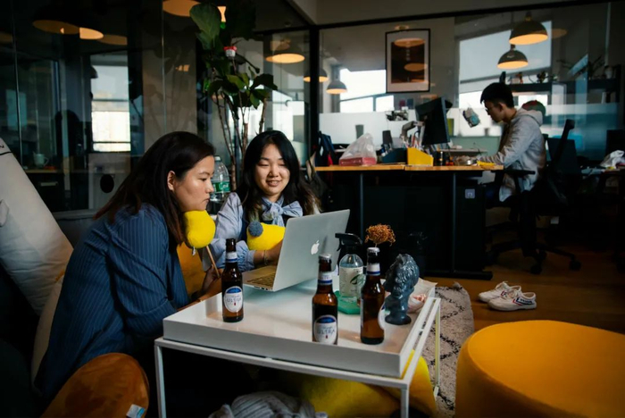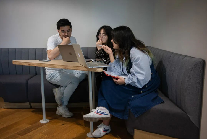 沈文馨(左)和公司伙伴正坐在地上讨论问题