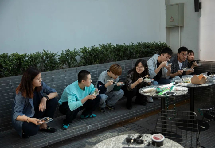 沈文馨的短视频制作团队蹲在露台上吃午饭