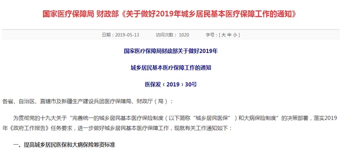 2019年,国家医疗保障局、财政部印发了《关于做好2019年城乡居民基本医疗保障工作的通知》(医保发〔2019〕30号)。