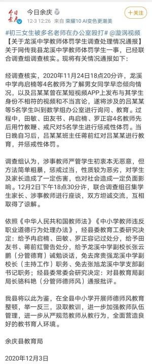 近日,贵州省余庆县初三女学生婷婷被曝遭到多名老师殴打一事引发关注。11月30日,余庆县教育局通报,涉事学校校长、副校长、教师已停职调查,深入调查正在进行中。据了解,目前家长已报警,余庆县相关领导也来到该女生家向其致歉。12月3日,余庆县宣传部官方微博发布情况通报称,关于网传我县龙溪中学教师体罚学生一事,已经联合调查组调查核实。(12月3日《封面新闻》)