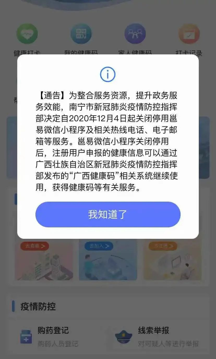 南宁市新冠肺炎疫情防控指挥部决定,自2020年12月4日起关闭停用邕易微信小程序及相关热线电话、电子邮箱等服务。今后,邕易注册用户申报的健康信息转至“广西健康码”相关系统,用户可前往获得健康码等。(南宁宝)点击看详情