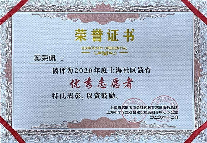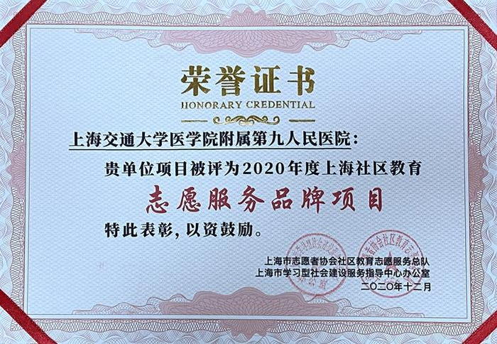 上海交通大学医学院附属第九人民医院社区志愿教育服务工作站被授予“2020年度上海社区教育优秀志愿服务工作站”,九院党委宣传处奚荣佩获“上海社区教育优秀志愿者”上台领奖,九院“医疗科普全媒体传播助力社区健康教育”获2020年度上海社区教育志愿服务品牌项目。