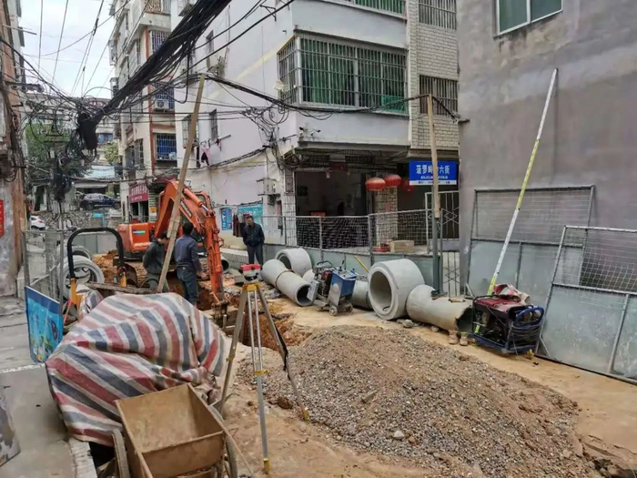 记者在南宁市砂石二公司宿舍的后门附近看到,在菠萝岭中四街至六街的市政道路上被蓝色挡板围挡圈处一块区域正在进行污水治理项目的施工,现场有挖掘机和施工人员在作业,地面被挖开一条沟,大量管道和砂石堆放一旁。值得一提的是,施工通告上注明施工时间为2020年10月9日至2020年11月30日。