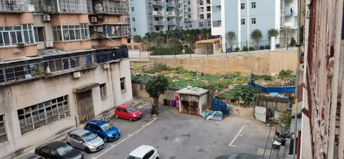 当日下午,记者来到江南区菠萝岭中五街的南宁市砂石二公司宿舍内看到,小区前门外一块狭长的空地上部分黄土裸露,大部分地方变成了菜地,不远处还有被蓝色挡板围挡遮住的大深坑,有黑色污水不断从中流出,味道十分难闻,与一墙之隔的广西轻工技师学院的新建职工宿舍楼形成鲜明对比。