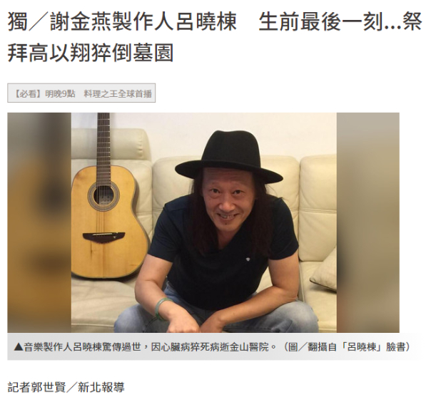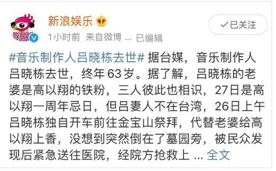 然而世事无常,据台湾媒体报道,高以翔的好朋友、台湾知名音乐制作人吕晓栋在2020年11月26日,高以翔去世一周年,去祭奠他时,突发意外猝死在了墓园中。