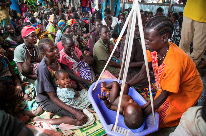 ▲当地时间2017年5月31日,南苏丹,位于南苏丹的巴赫尔阿尔加扎尔北部的帕索,一个由国际救援委员会(IRC)运作的营养中心内一位母亲将自己营养不良的孩子放在吊篮上。图/视觉中国