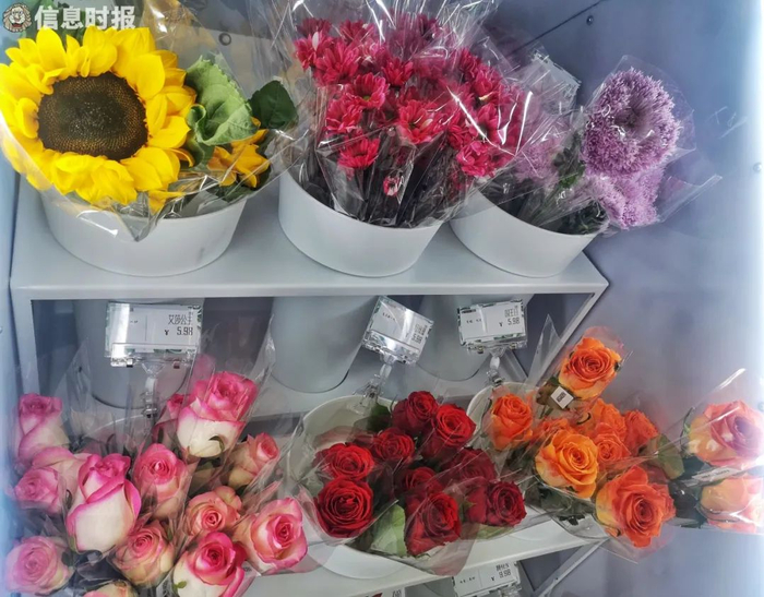 记者了解到,目前在陈家祠和芳村地铁站各有一台鲜花自动售卖机,该机器比普通的饮料自动售卖机稍大,透明的玻璃柜里被分为4层12格,每个桶里都放着一小束不同种类的鲜花,如玫瑰、小雏菊、向日葵等,价格在5.98元—9.98元之间,其中还有一款特价花仅需3.98元一支。