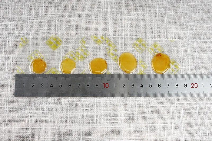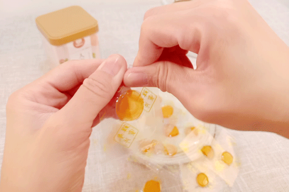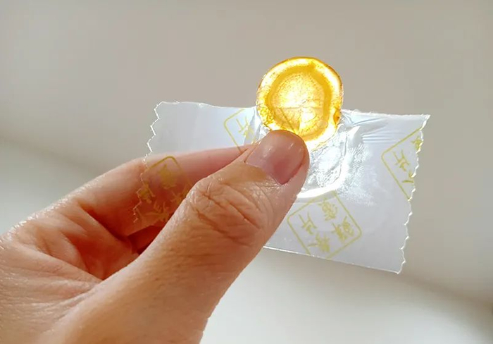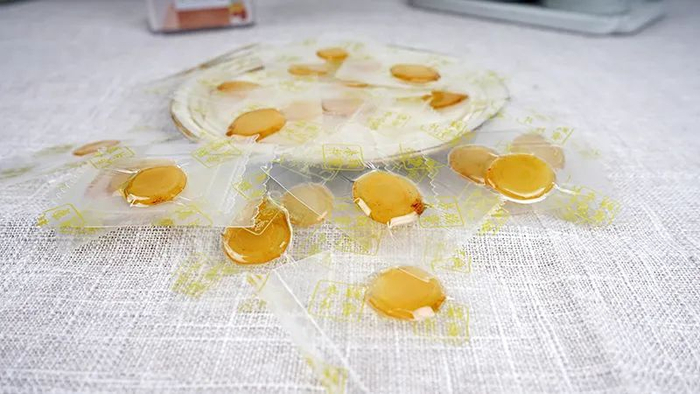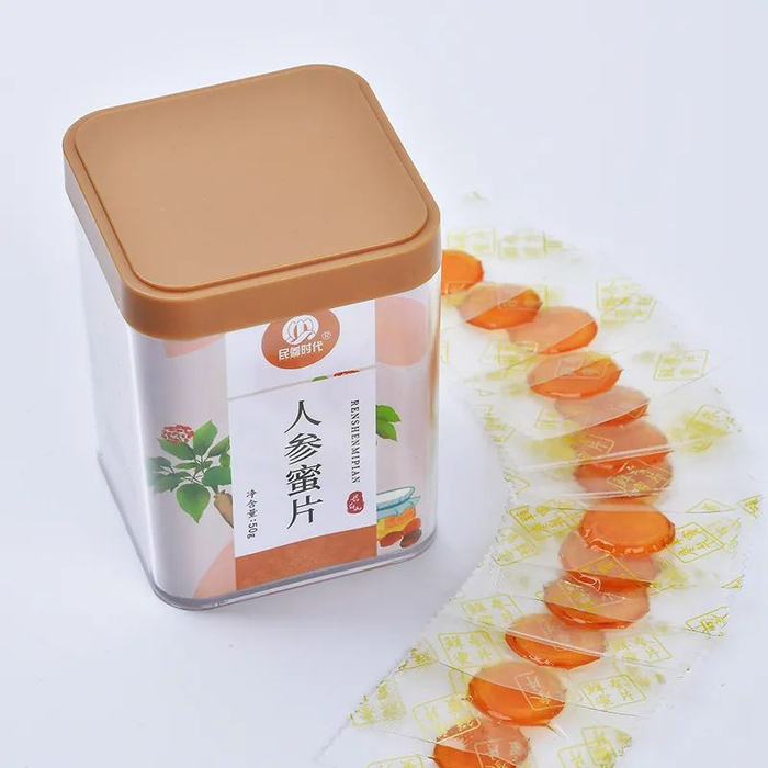 每片独立小包装,比常见的塑料材质更厚实,将人参蜜片真空在其中。