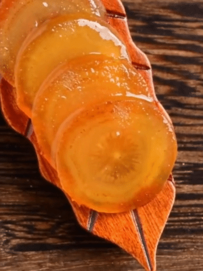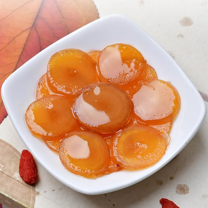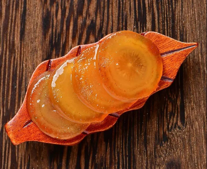 这款人参片用椴树蜜浸泡过,外表晶莹透亮像琥珀一般。既有人参的微苦芳香,又有蜂蜜的甜蜜口感。软糯香甜,不用煮不用泡,开袋即食。
