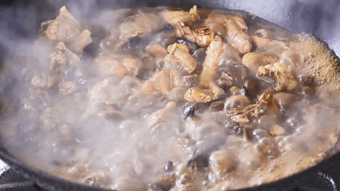 在被汤没过的鸡肉里下入榛蘑跟粉条,