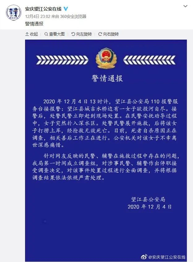 4日23时,@安庆望江公安在线 通报称,12月4日13时许,望江县公安局110报警服务台接到报警:望江县城吉水桥边有一女子欲投河自尽。接警后,处警民警立即赶到现场处置。在民警安抚劝导过程中,女子突然扑入深水区。处警民警展开施救,后将该女子打捞上岸,女子经抢救无效死亡。目前,死者自杀原因正在调查,相关善后工作正在进行。公安机关对该女子不幸离世深感痛惜。