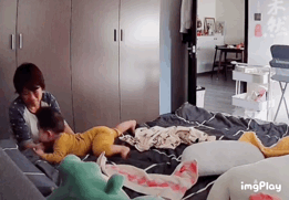 宝宝扭头看见阿姨,立马笑了起来,翻身打滚,翻进阿姨怀里伸懒腰。