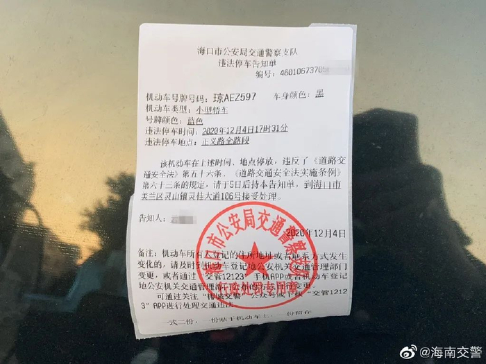 @海南交警 在微博中发布了《海口市公安局交通警察支队违法停车告知单》。告知单显示,处罚的机动车为琼AEZ597的黑色小型轿车,该车12月4日17时31分的违法停车地点位于正义路全路段。
