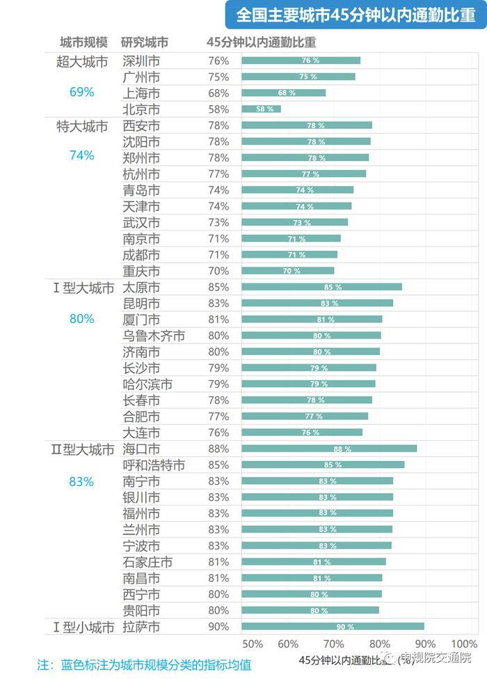 全国主要城市45分钟以内通勤比重76%