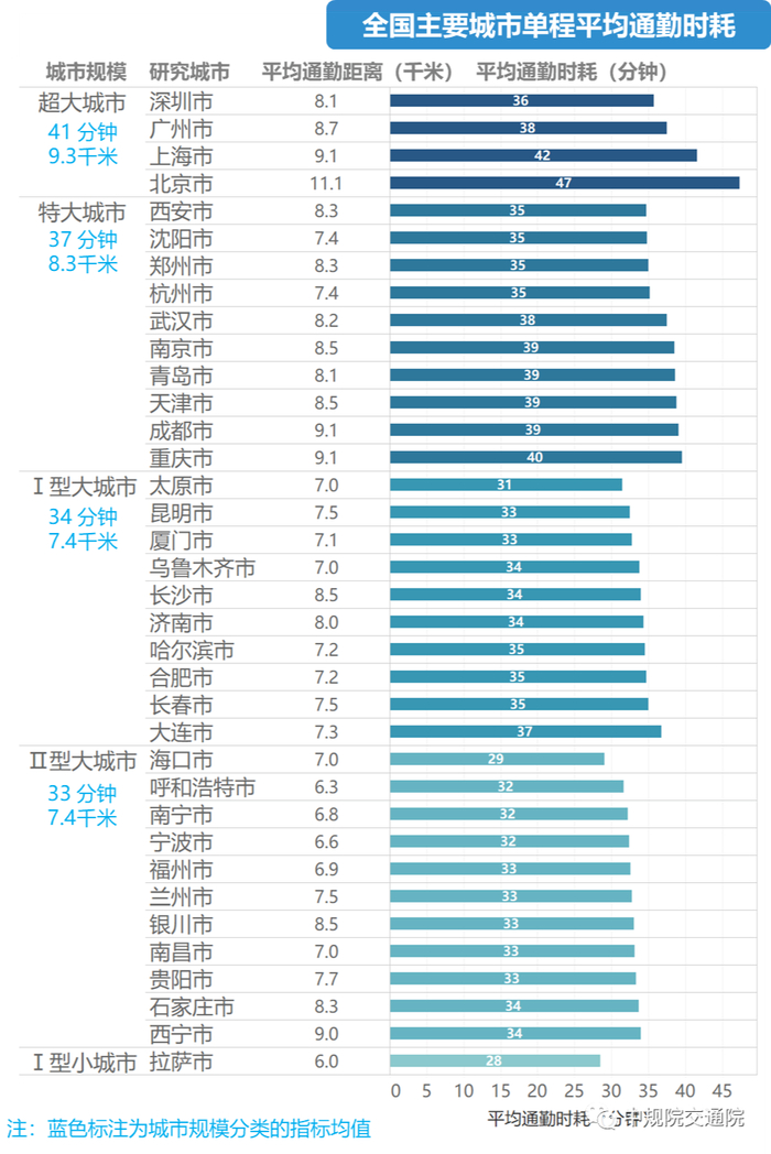 36分钟,是全国主要城市通勤人口的单程平均时耗。其中,超大城市平均通勤时耗41分钟,特大城市37分钟,Ⅰ、Ⅱ型大城市分别为34、33分钟。