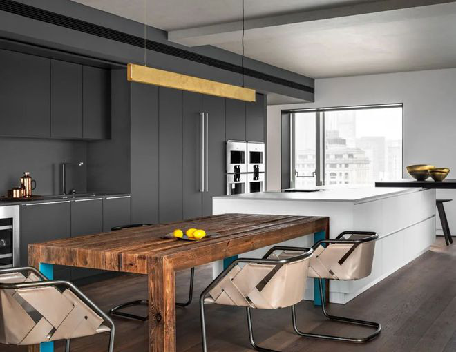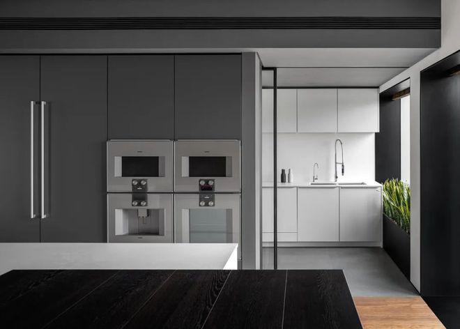 而在“厨房”这一家居重地上,方磊也给予了高度重视与完美融合。季公馆的厨房以餐桌与岛台的一体顺延,与西厨和中厨形成开放互联,遵循着豪宅应有的比例尺度。加上三面落地窗让这里拥揽绝佳的视野与采光,越发诠释出大都会的俊朗风度。正如他所提倡的:“让建筑思维延续启迪室内设计,营造自然舒适的一体化空间”。