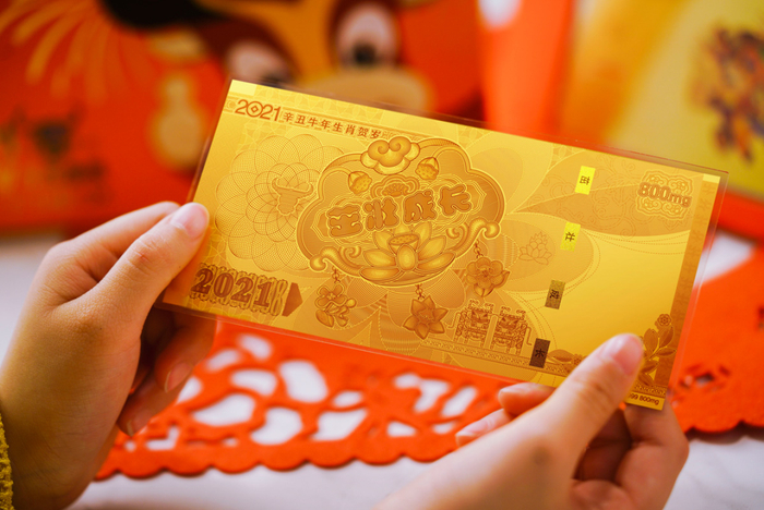 此外,牛年压岁金采用多种时尚工艺,好玩又有趣。采用香味油墨工艺,用手指搓一搓牛壮壮的大拇指和牛犇犇的牛鼻子,还可以闻到牛奶糖的香味。缤纷斑斓的烟花盛景与漂浮的祥云使用镭射彩印与磁性油墨工艺,营造绚丽多彩的好年景,好似春晚的热闹景象。背面烫金线处,采用2D变图工艺,晃动时“陪你长大”字样变成“茁壮成长”字样,在细微之处隐藏父母长辈朴实而真挚的祝福与祈愿。压岁金背面倾斜,可以看到牛头状“中国牛”满版暗记,为孩子新年“哞”福气。