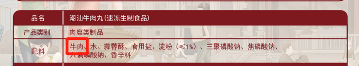 原料排前面的就是牛肉,没有鸡肉、猪肉这些,吃起来就像嚼牛肉一样扎实有弹性,但又多了一份脆爽。