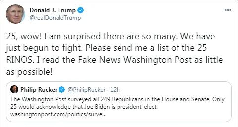 “25人,哇!我很惊讶有这么多(叛徒)。我们才刚刚开始战斗。请发给我一份这25名RINO(观察者网注:即‘徒有其名的共和党人’缩写,含贬义)的名单,我几乎不看假新闻《华盛顿邮报》的 。”