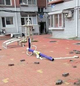 根据王先生提供的图片,记者看到楼前小院两排晾衣架被连根拔起,底部的方砖撬起后扔在一边,这些晾衣架横七竖八的扔在楼前空地上,看起来异常刺眼,另外,还有一部健身器材被连根拔起……