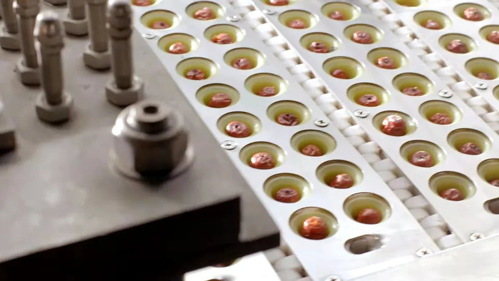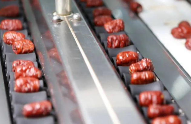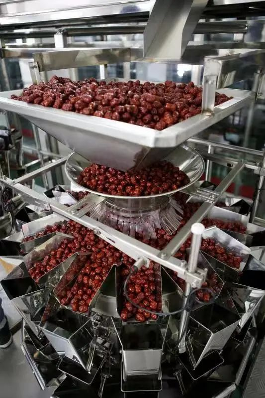 紧接着红枣经过传输带进入自动化的去核“工程”,每一颗枣果被妥帖地安置在各自的“小房间”里,随着科学设定好数据实现自动化去核。