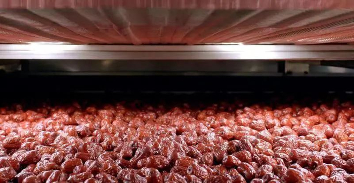 然后进入烘干,光鲜亮丽的红枣们均匀地躺在网链上,享受着舒适的“桑拿浴”,让红枣处于枣肉与枣果顺利分离的状态,确保去核时尽可能地保留果肉。