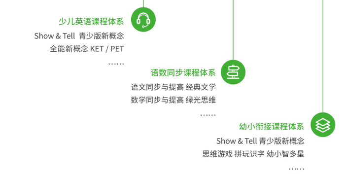 针对教学改制以及当代孩子的能力需求,绿光升级后的少儿英语、语数同步、幼小衔接三大系列的教学产品,不仅有全新的教学理念,还有深度的教研模式以及与教学改革高度匹配的服务产品,为孩子们打造全科一站式教学服务。