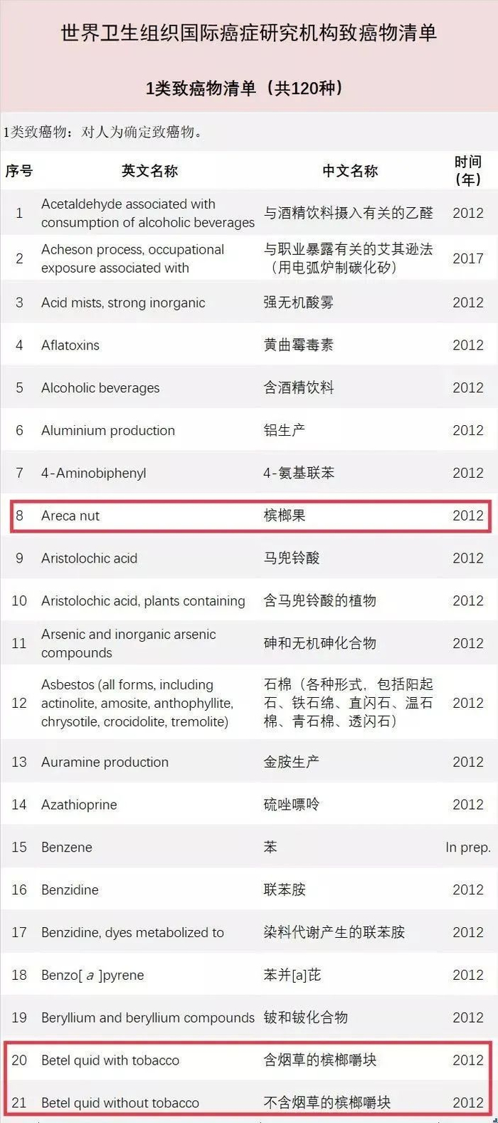 在2012年更新的1类致癌物清单中,与槟榔相关的致癌物增加到了3种。