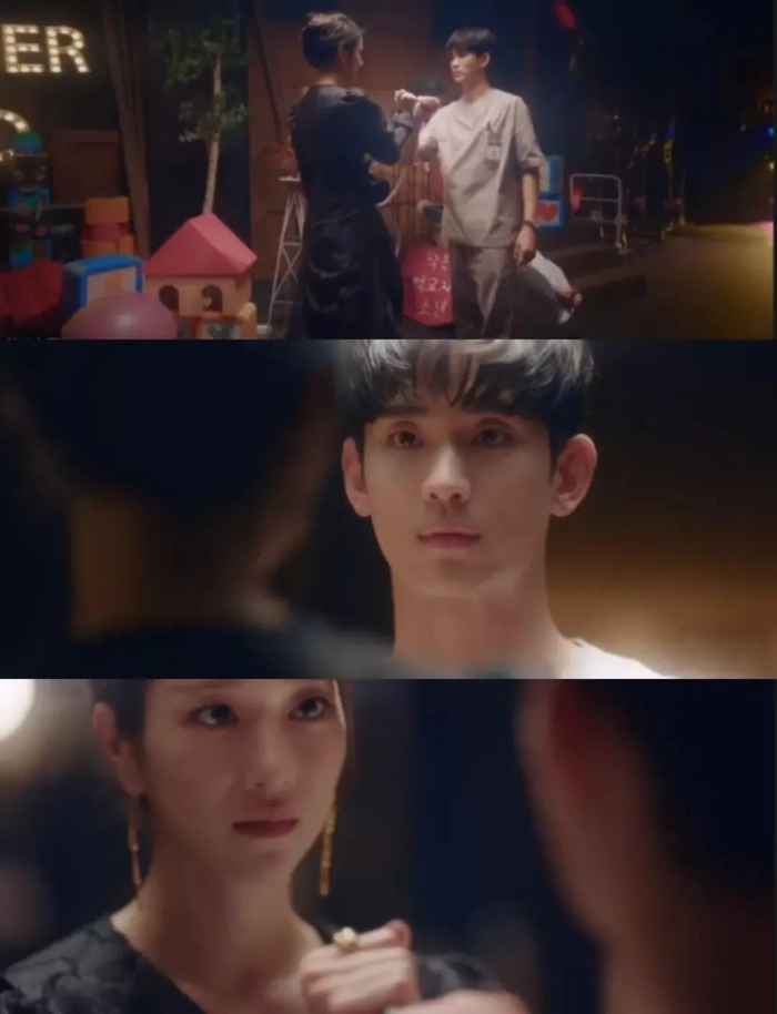 他们第一次的相遇,文康泰抓着高文英捅向变态男的刀子,一动不动地看着她的双眼。