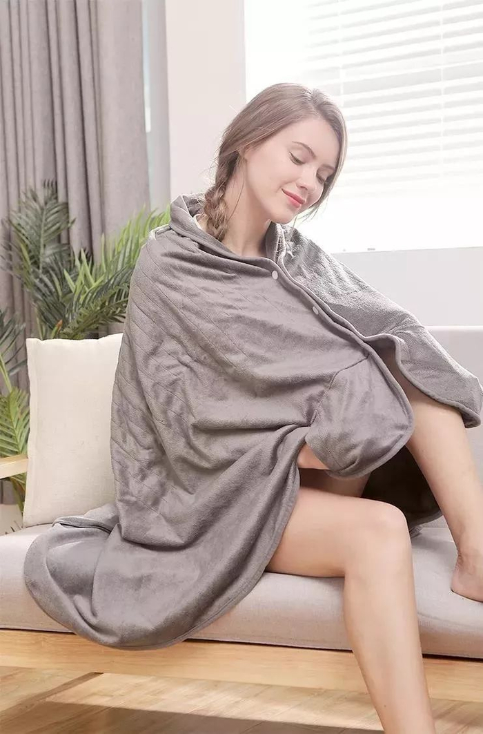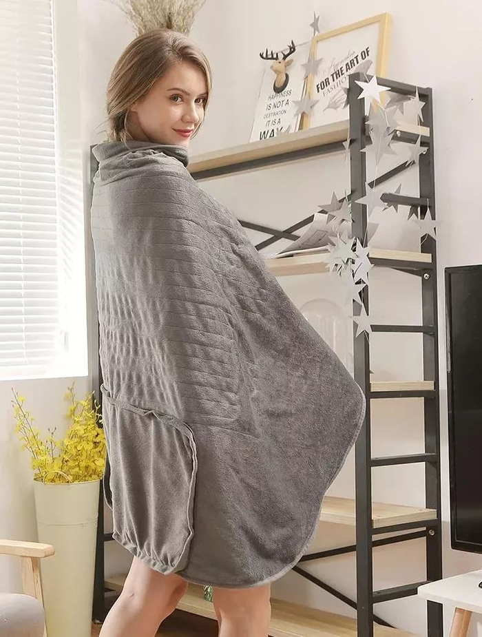 传统的毛毯只能盖着暖腿,手就会冻得冰冷。而这款电热毯不仅当护膝毯子还可以当披肩。