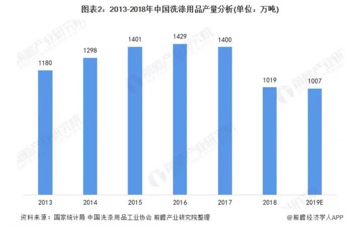 根据国家统计局数据,2018年我国洗涤用品行业主营业收入从2017年的1758亿元降到了1474亿元,利润也从2017年的129亿元降到了103亿元。整个2018年,我国洗涤用品(合成洗衣粉、体洗涤剂和肥皂)产量约1019万吨左右,前瞻产业研究院推算,2019年我国洗涤用品产量约1000万吨左右。
