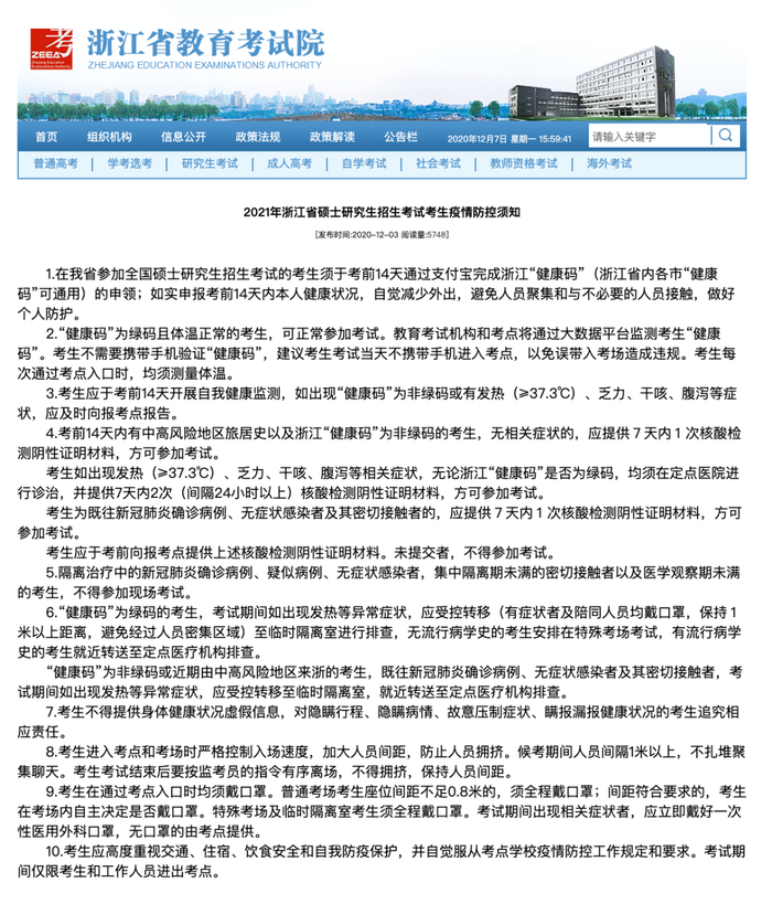 浙江省提醒考生,须于考前14天完成本人浙江“健康码”的申领,每天测量体温,确保防控工作安全可靠。