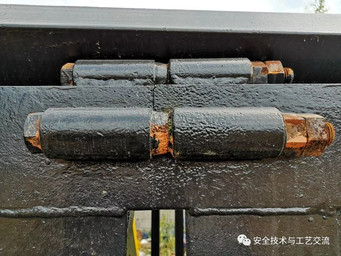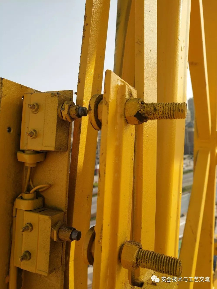 塔吊空载时,大臂一侧螺栓松动现象是这样的:中间那条缝是给塔吊标准节通风散热的吗……