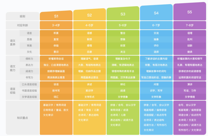 在给孩子报名斑马语文之前,就了解到其课程体系有5个级别,从S1-S5逐级而上,S1适合3-4岁孩子,S2适合4-5岁孩子,S3适合5-6岁孩子,S4适合6-7岁孩子,S5适合7-8岁孩子,并且不同级别学习知识点不同,难度也不一样。