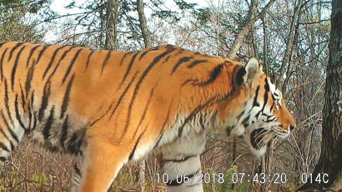 “眼亮似火、体形健硕,头顶‘王’字、威风凛凛漫步山林,百兽之王的雄姿和气势一览无余。”这是2018年10月6日东京城林业局有限公司巡护人员架设的远红外监测仪拍摄到的最真实、最清晰和最完整的野生东北虎影像。类似的影像记录在我省东北虎豹国家公园试点区内已不鲜见,仅今年5~6月,在东京城林区,就先后三次发现野生东北虎、两次发现野生东北豹的踪迹链和影像。