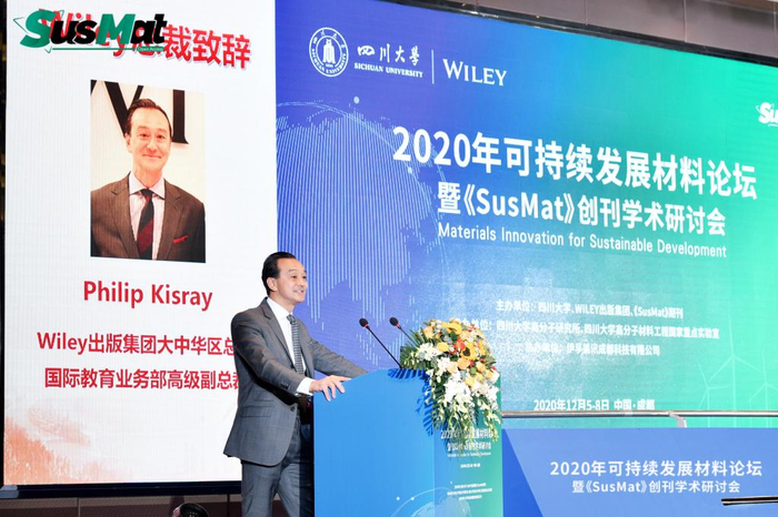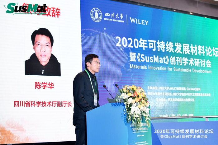 四川省科技厅副厅长陈学华、《SusMat》主编王琪院士及WILEY出版社集团大中华区Philip Kisray总裁依次致辞,对会议的召开及《SusMat》的创刊表示热烈祝贺,并希望《SusMat》在四川省科技及相关产业发展,以及全球可持续发展中起到有力的推动作用。