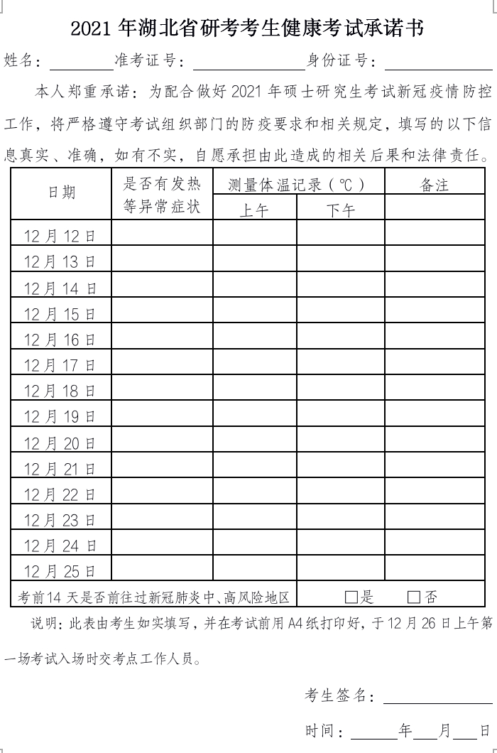 湖北省要求考生如实记录本人考前14天(12月12日至25日)的健康监测情况,填写《2021年湖北省研考考生健康考试承诺书》,并于12月26日上午第一场考试时交考点工作人员,主动配合考点其他各项防疫措施等。