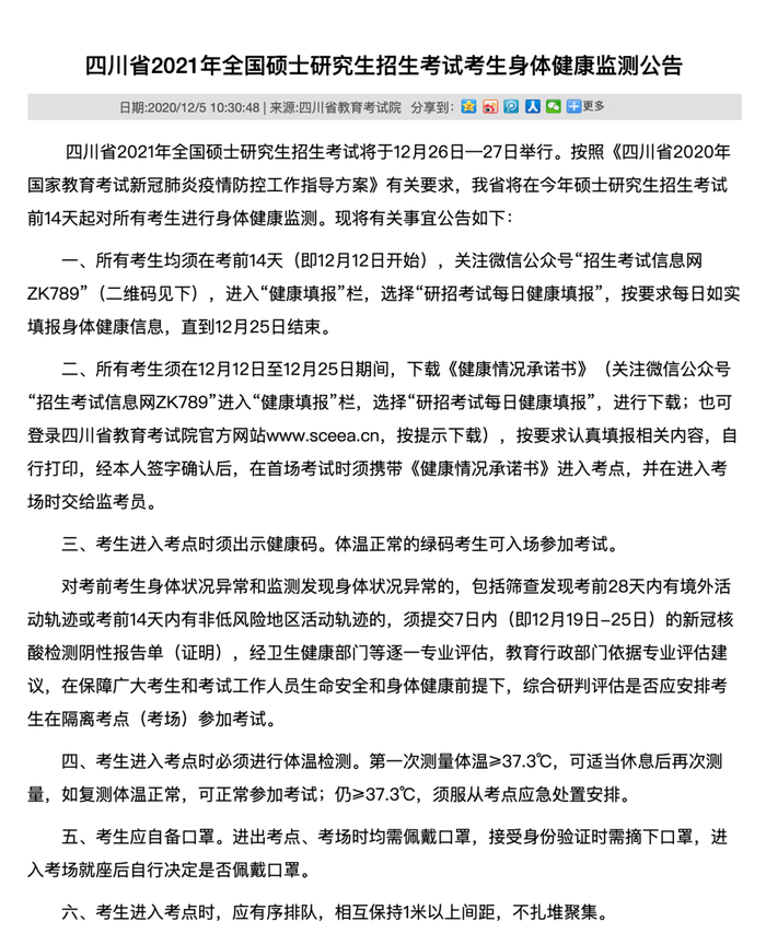 四川省要求,筛查发现考前28天内有境外活动轨迹或考前14天内有非低风险地区活动轨迹的考生,须提交7日内(即12月19日至25日)的新冠核酸检测阴性报告单(证明)。