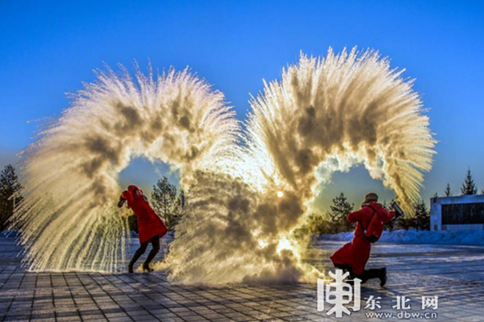 冬季打开网红打卡地神州北极碑的正确方式,是在零下几十摄氏度的温度下,划出最炫目的“泼水成冰”曲线。