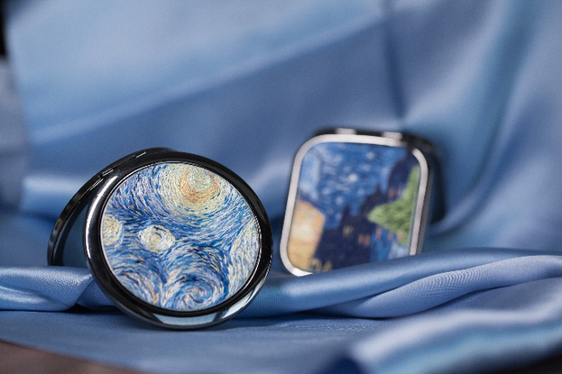 以梵高的《星空》为灵感,创作出的苏绣化妆镜