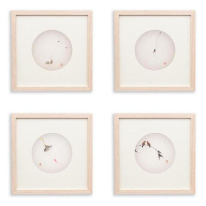 张雪表示“很多文字是富有画面感的,而这种画面感恰好也可以用苏绣表现”,并逐渐形成了自己的苏绣风格。张雪的代表作品之一《四季》就体现了留白手法的无尽诗意和想象。春是两只飞燕,夏是一声蝉鸣,秋是一弯残蓬,冬是几枝枯叶。画面简约,色彩淡雅,传达出空灵、清雅的意境。“姑苏城外寒山寺,夜半钟声到客船”,张继的名诗落在姑苏绣郎张雪的针尖下,黑白的意境映照了张继孤独的心境,画面无钟,钟声又无处不在,偌大天地中只有点点渔火。