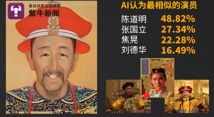 “另外,因为宫廷剧是重要的影视题材,所以我也想到了修复好各位‘皇帝’后,再找出曾经影视剧里的扮演者,智能比对他们的相似度,会相当有趣。”于是大谷的第二个准备工作,就是查每一位皇帝在影视资料中都由哪些演员扮演过。这个工作量挺大,影视作品的时间跨度也长,所以很费时间。记者看到,他罗列出了十多部涉及宋太祖的影视作品,从这些作品里找到了角色图,选取出好的角度,将这些图片导入到专门进行人脸识别的人工智能里进行识别。