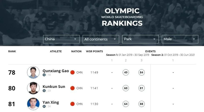 世界滑板联合会网站显示,目前街式滑板奥运资格排名最高的中国女子选手为15岁的曾文慧,排名为第19位;男子选手为20岁的潘家杰,排名为第91位。公园赛方面,排名最高的中国女子选手为22岁的张鑫,排在第27位;男子选手为18岁的高群翔,排名为78。