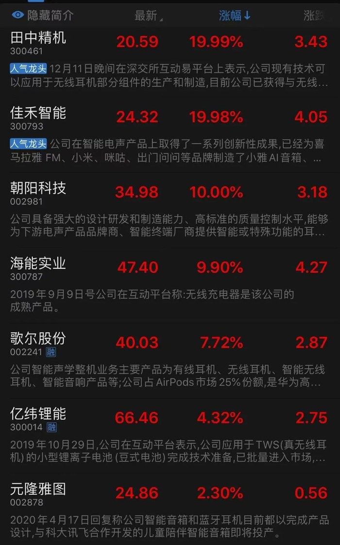 个股方面,佳禾智能、田中精机等个股均涨逾10%,千亿市值龙头股歌尔股份涨逾7%。