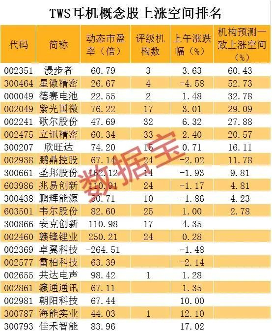 A股市场上合计有20多只TWS耳机概念股。其中,机构最关注的就是上述两只个股,歌尔股份有32家机构评级,立讯精密有33家机构评级。